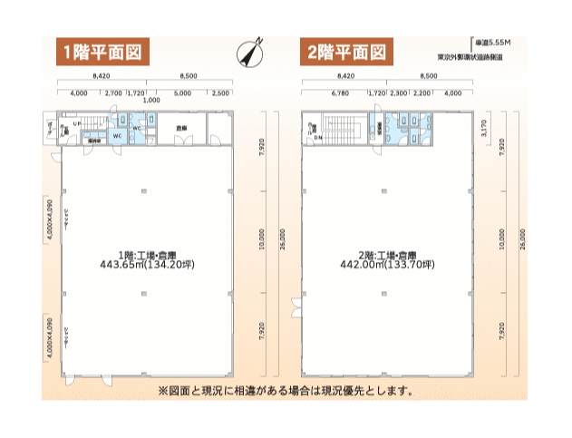 - ■1階134.2坪/2階133.7坪、1棟貸し ■男女別トイレ ■駐車場3台分以上あり ■24時間稼働可能 ■大型車出入可