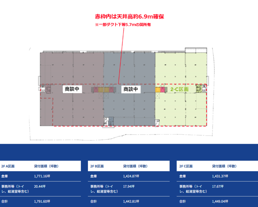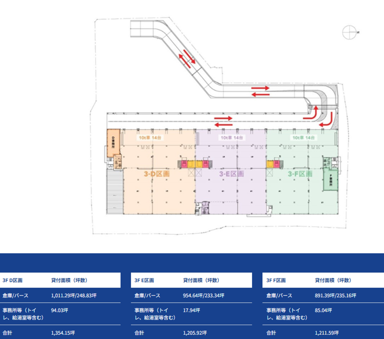 - ■梁下有効天高:5.5m以上■床荷重:1.5t/㎡■荷物用EV:6基■垂直搬送機:6基 ■バース数:1階41台(10t用)/3階42台(10t用)■ドックレベラー:1階11基/3階12基■トラック待機場:19台■乗用車駐車場:132台■駐輪・バイク置き場:188台