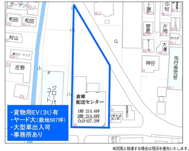 - ■倉庫1-2階各213.6坪 ■2階建事務所 ■貨物用EV(3t) ■トイレ2ヶ所 ■駐車場3台分以上 ■ヤード大(敷地507坪) ■大型トラック搬入可
