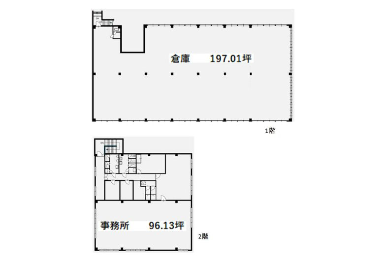 - ■1階倉庫197.01坪/2階事務所96.13坪、1棟貸し ■1階75㎝底上げ ■敷地面積416.20坪/隣接駐車場79.70坪
