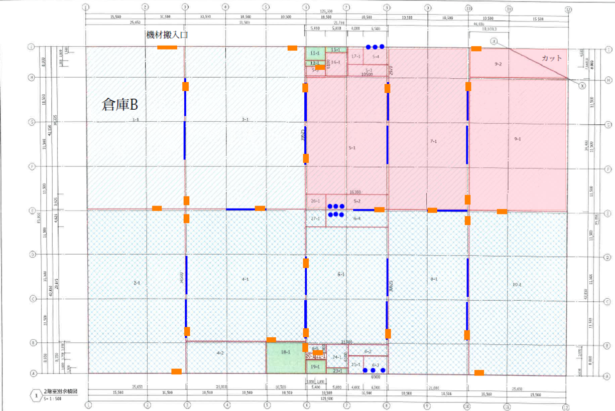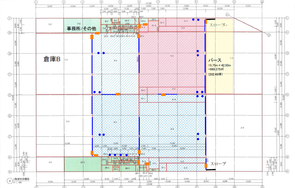 - ■エレベーター(3.5t) 2基 ■垂直搬送機 4基 ■ベンチレーター 4基 ■駐車場 乗用車105台 ■トラック待機場 15台