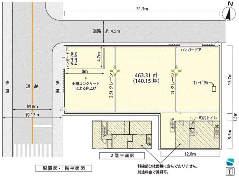 - ■大型車両 可 ■クレーンあり(2.5t 1基、2.0t 1基)