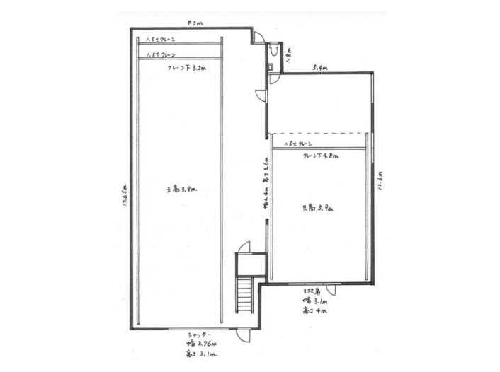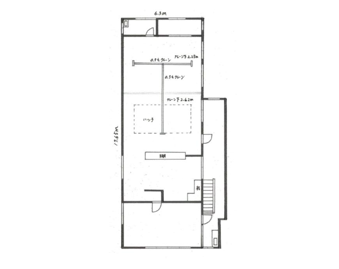 - ■1階68坪/2階41坪、1棟貸し ■クレーン:1階3機(1.5t)、2階2機(0.5t) ■2階床補強箇所あり ■トイレ、都市ガス ■エアコン(残置物)