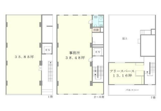 - ■1階35.85坪(駐車場や倉庫)/2-6階各38.48坪(事務所)/7階13.16坪(フリースペース)屋上、1棟貸し ■個別空調 ■EV1基