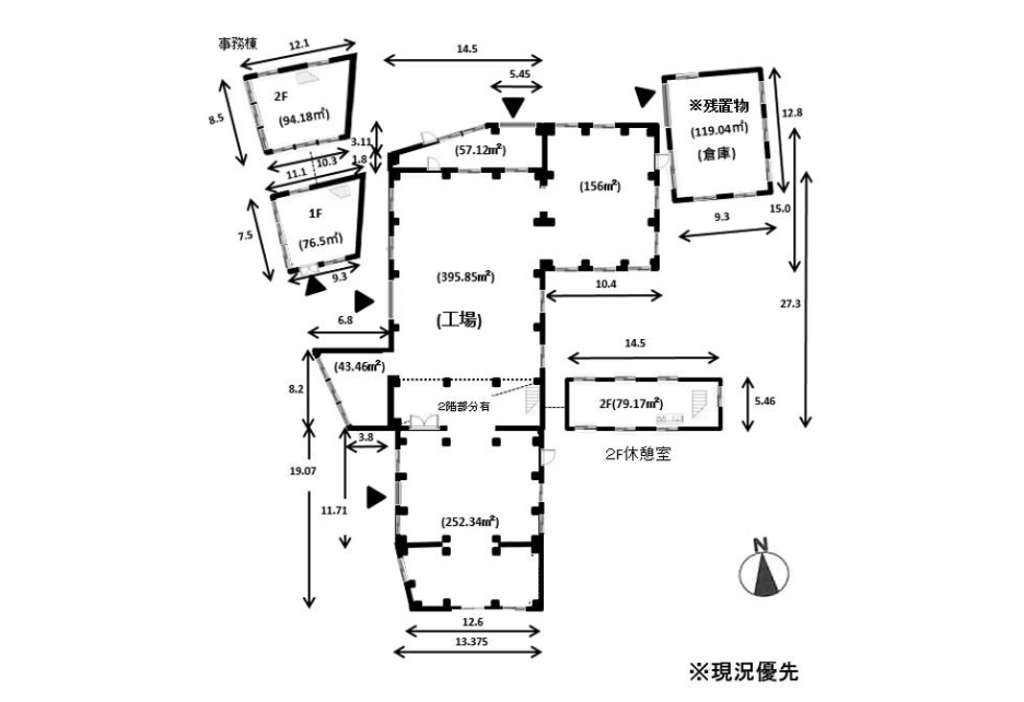 - ■工場・倉庫335.4坪/事務棟51.6坪 ■キュービクル、2.8tクレーン(維持管理修繕は借主負担) ■水道、トイレ ■都市ガス引込応相談(事務所) ■北東の倉庫は残置物 ■駐車場30台分以上(車種による)