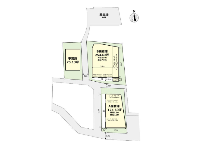 - ■A棟174.69坪/B棟254.62坪/事務所75.13坪 ■オーバースライダー(A棟):(W=4m×H=4.2m)×2、(W=2.5m×4.2m)×1 ■電動シャッター(B棟):(W=6m×H=4.2m)×1、(W=3.6m×H=4.2m)×1 ■男女別トイレ ■駐車場空き12台(5,000円/月/台) ■24時間利用可、土日・祝日利用可 ■大型トラック搬入可
