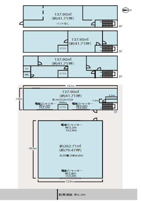 - ■倉庫部分 鉄骨造ストレート葺 平屋建て ■事務所部分 鉄骨亜鉛メッキ鋼板葺 地上4階建て
