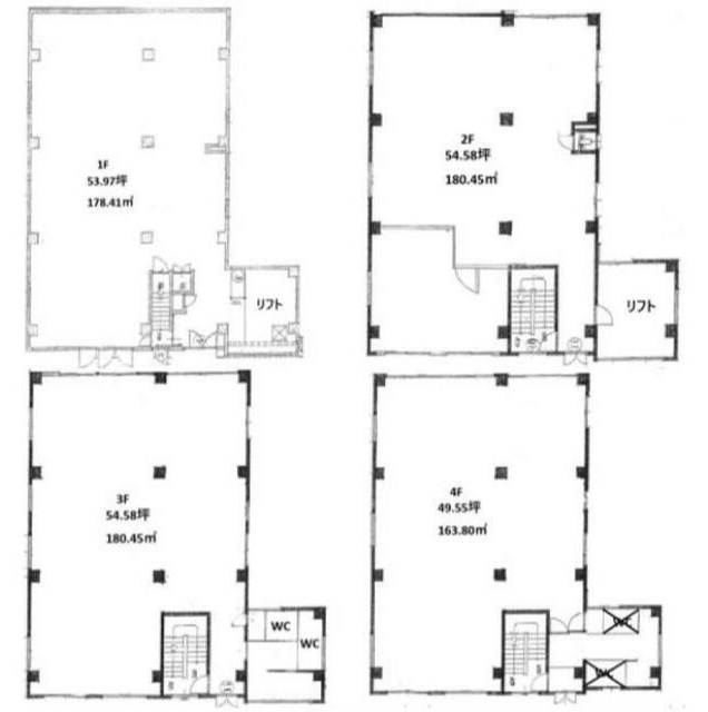 - ■1階53.97坪/2階54.58坪/3階54.58坪/4階49.55坪、1棟貸し