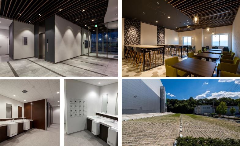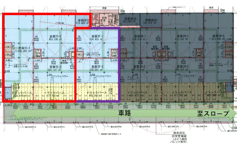 - ■駐車場:181台(管理用含む)小型115台、軽65台、車いす用1台 ■トラック待機スペース:8台(大型5台+中型3台) ■倉庫柱スパン:10.3m×10.5m ■トラックバース:高床式1.0m(1階・2階)奥行 約13.5m ■ドックレベラーあり ■垂直搬送機:E区画1基、F区画1基(積載荷重1.5t)かご寸法3500W×4000D×3200H