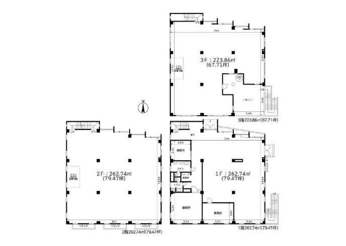 - ■1-2階各79.47坪/3階67.71坪 ■プロパンガス、東京電力、公営水道、公共下水 ■土日・祝日利用可 ■駐車場:普通車9台、4tトラック1台駐車可能 ■内装造作工事相談可能 ■設備全て残置物扱い