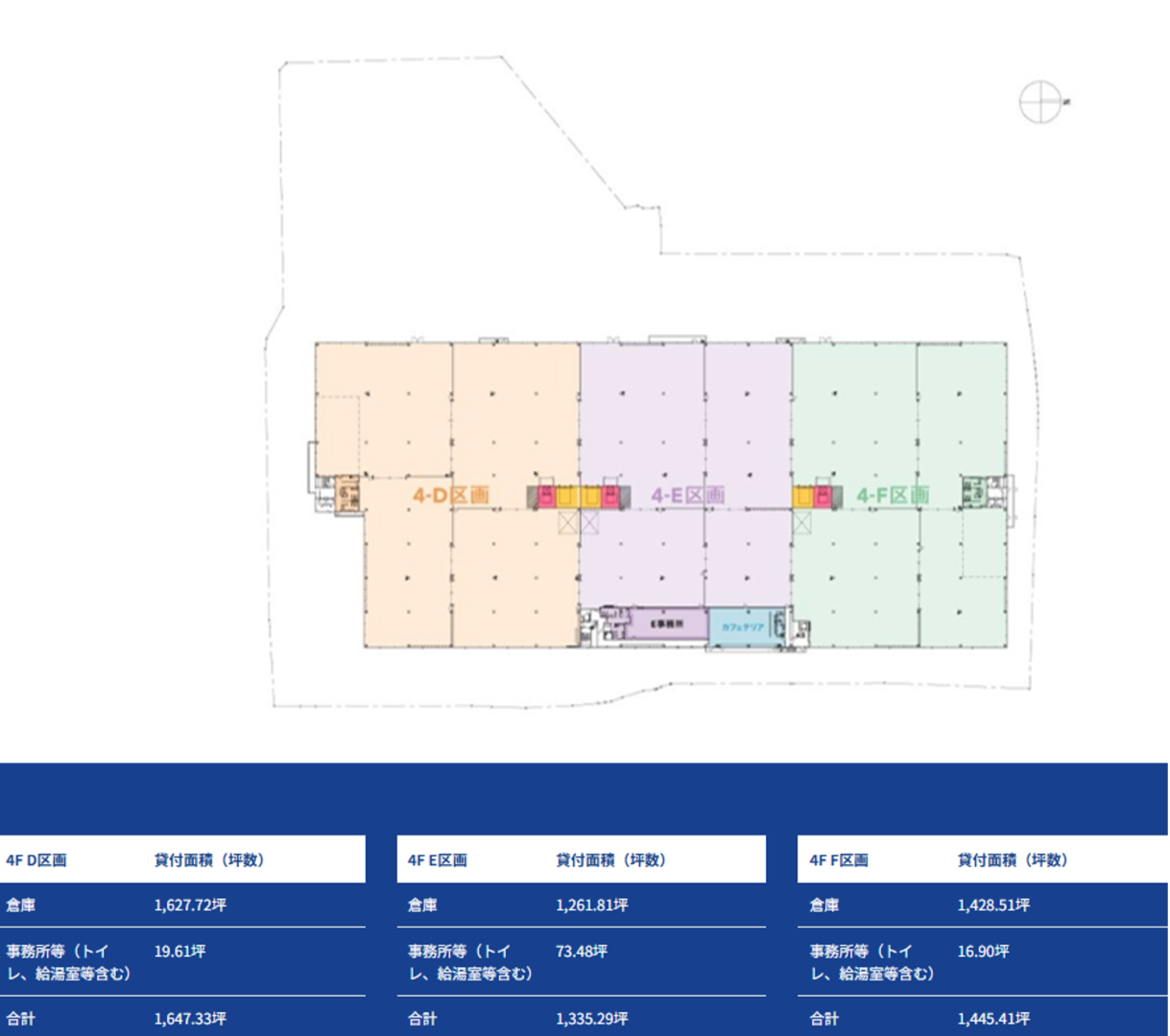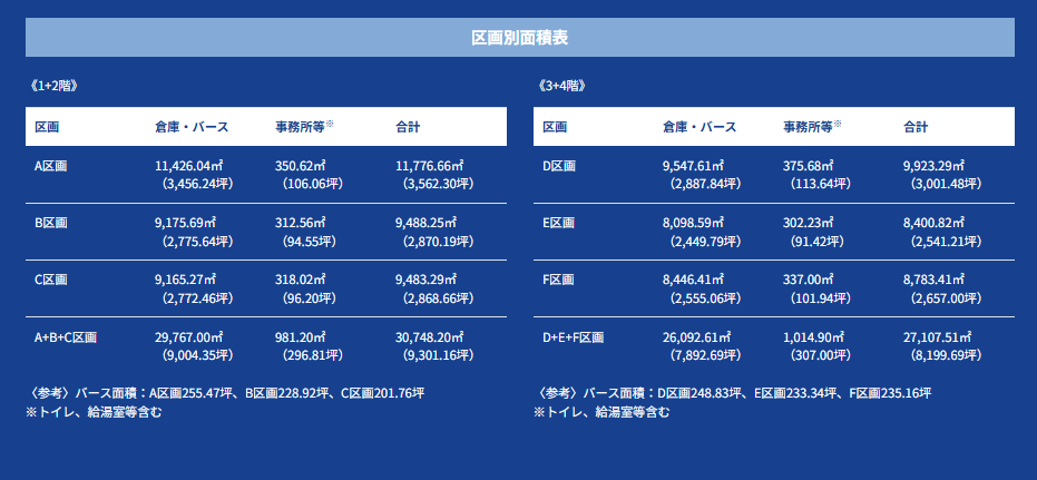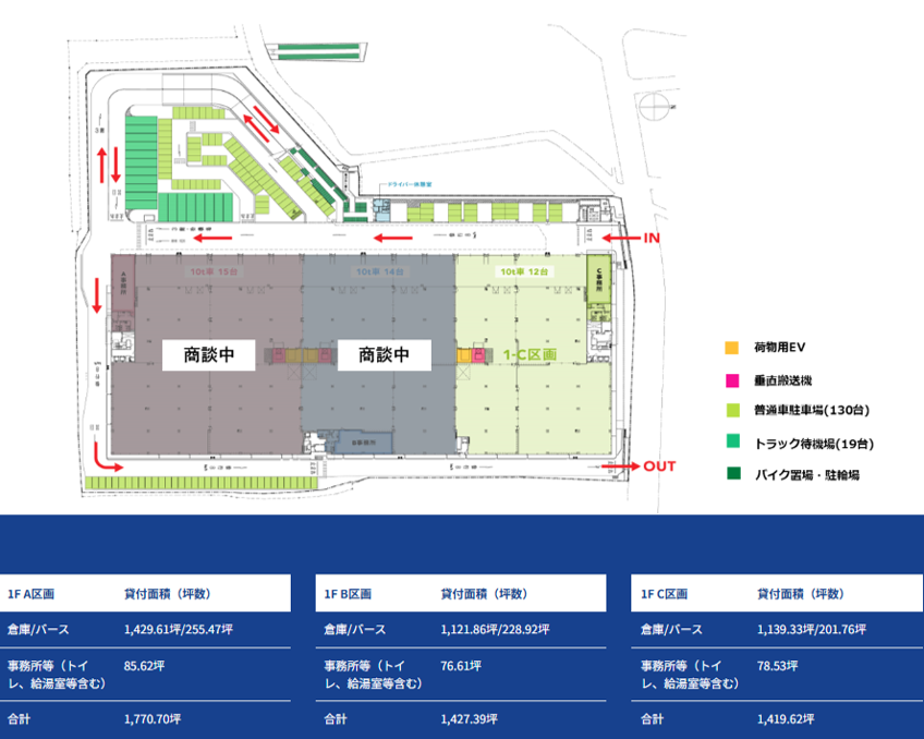 - ■梁下有効天高:5.5m以上■床荷重:1.5t/㎡■荷物用EV:6基■垂直搬送機:6基 ■バース数:1階41台(10t用)/3階42台(10t用)■ドックレベラー:1階11基/3階12基■トラック待機場:19台■乗用車駐車場:132台■駐輪・バイク置き場:188台