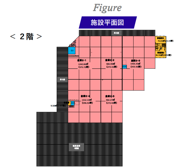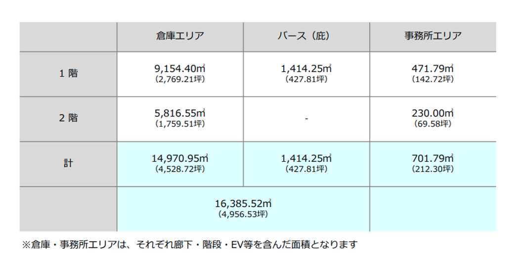 - ■梁下有効高:1階 高床5.5m/2階 高床5.5m 低床6.5m■床荷重:1階2.0t/㎡ 2階1.5t/㎡■荷物用EV:1基(4.0t)■垂直搬送機:2基(1.5t)■ドッグレベラー:1基
