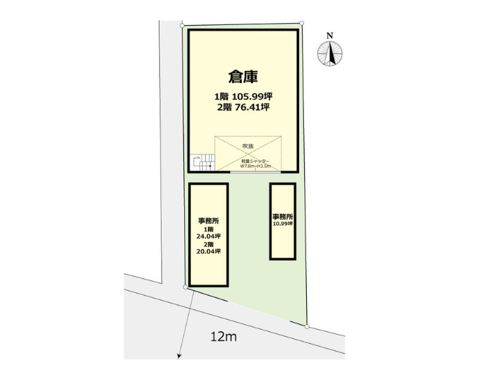 - ■倉庫:1階105.99坪/2階76.41坪 ■別途事務所建物:44.08坪(1階24.04坪/2階20.04坪)/10.99坪 ■軽量シャッター(H3.5m×W7.8m) ■男女別トイレ、キッチン、エアコン ■荷積みスペース、駐車スペースあり ■天井高2.5m以上 ■24時間利用可、土日・祝日利用可 ■大型トラック搬入可