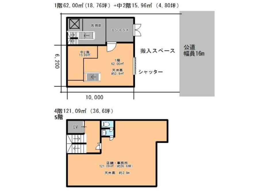 - ■1階18.75坪/中2階4.82坪/4-5階各36.62坪 ■EV ■電気、水道、トイレ、キッチン、エアコン(残置物) ■車寄せスペース、荷積みスペース ■土日・祝日利用可