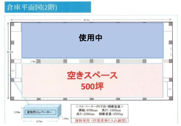 - ■貨物用EV(3.5t、横幅6700㎜高さ2200㎜奥行1900㎜) ■電気、上水道、トイレ ■大型車、40フィートコンテナ搬入可能 ■防火シャッター高さ4000㎜ ■寄託条件付き(条件相談)