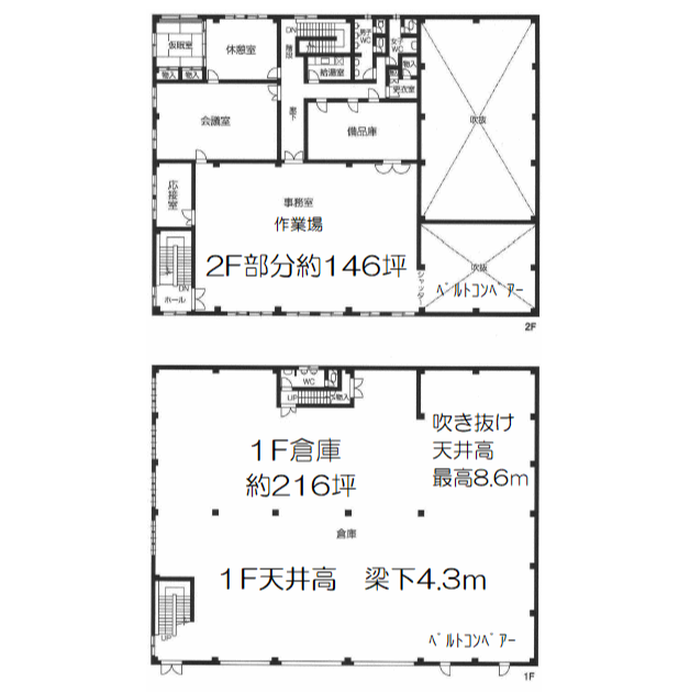 - ■1階倉庫216坪/2階事務所146坪、1棟貸し ■動力、水道、トイレ、手動オーバースライダーシャッター付き、LED照明、ベルトコンベアの譲渡相談可 ■駐車場空き20台 ■大型トラック搬入可