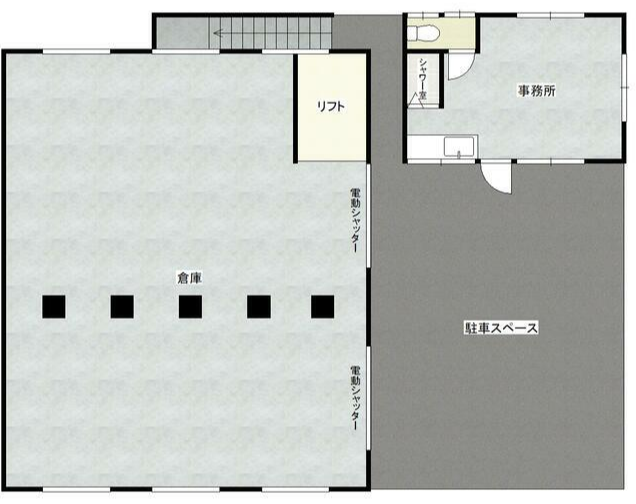 - ■倉庫内リフト(300㎏以内) ■事務所(LPガス:借主様設置) ■トイレ、シャワールーム ■電動シャッター ■駐車場3台分以上 ■2025年9月外壁塗装、屋根の防水工事済み