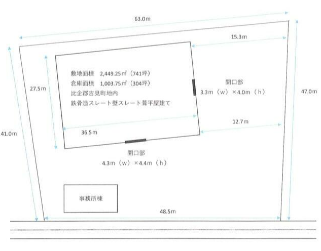 - ■平屋建て ■シャッター(W4.3m×H4.4m、W3.3m×H4m) ■トイレ ■車寄せスペース、荷積みスペース ■大型トラック搬入可