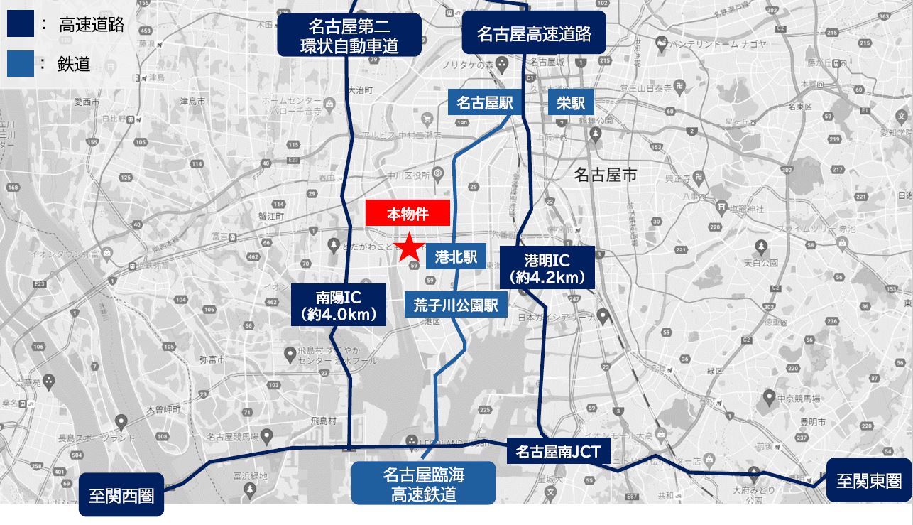 - ■名古屋第二環状自動車道「南陽」IC 約4.0km ■名古屋高速道路「港明」IC 約4.2km ■名古屋臨海高速鉄道あおなみ線「港北」駅 徒歩20分 ■名古屋臨海高速鉄道あおなみ線「荒子川公園」駅 徒歩20分