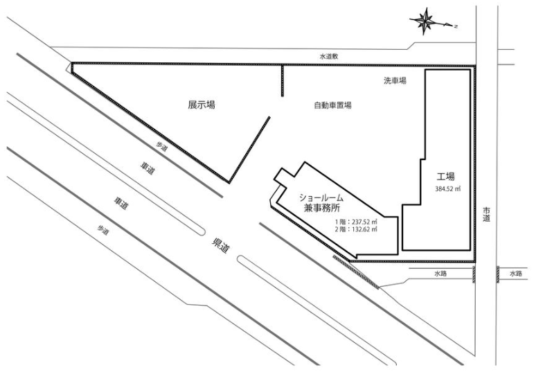 - ■事務所・工場:116.31坪 ■店舗・事務所:1階71.84坪/2階40.11坪 ■荷積みスペース ■元自動車修理工場 ■室内リフォーム後引渡し