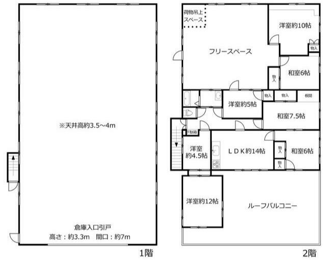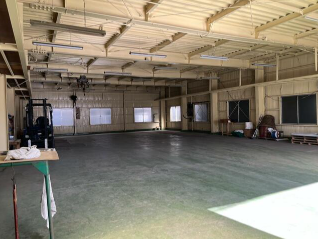 - ■居宅付倉庫、1棟貸し ■1階倉庫約73坪 ■倉庫入口引戸(高さ約3.3m、間口約7m) ■都市ガス、電気、上下水道、トイレ