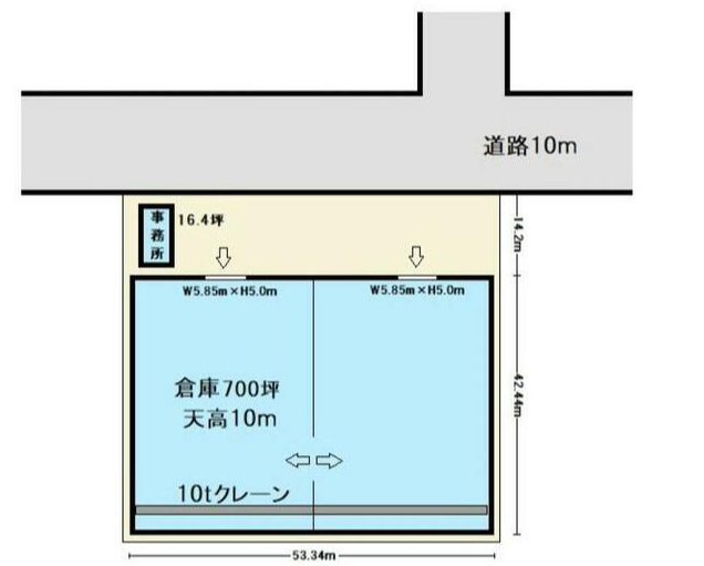 - ■10t走行クレーン ■電動シャッター ■車寄せスペース、荷積みスペース ■駐車場3台分以上 ■24時間利用可、土日・祝日利用可 ■大型トラック搬入可 ■天井高10m以上