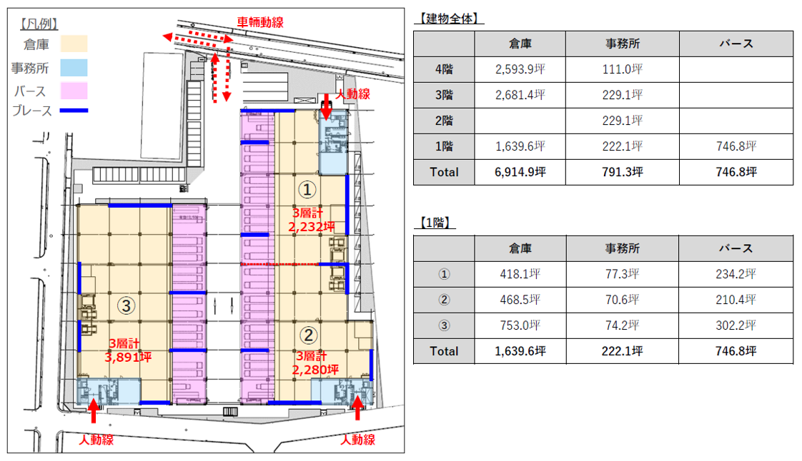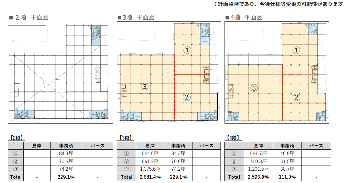 - ■乗⽤エレベーター:3台 (予定) ■荷物⽤エレベーター:3台(予定) ■垂直搬送機 :4台(予定) ■ド ッ クレベラー: 6基(予定) ■駐⾞場:乗⽤⾞50~70台(機械式駐⾞場、来客⽤含む)