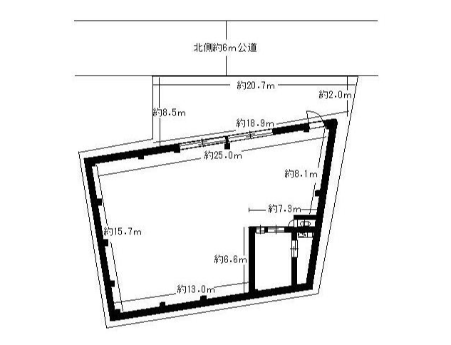 - ■平屋建て ■入口:幅約4.6m、高さ約3.9m ■電気、上下水道 ■前面駐車スペース約100㎡あり