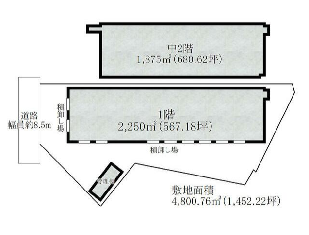 - ■1階567.18坪/中2階680.62坪 ■バース10台、庇6m ■シャッター(幅5m×高3.6m) ■大型トラック搬入可