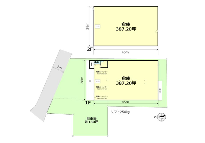 - ■1階387.20坪(庫内事務所・トイレ11.5坪)/2階387.20坪/事務所5.6坪、1棟貸し ■電動シャッター(W=7m×H=4m)2ヶ所 ■リフト1基(250kg) ■男女別トイレ ■動力あり ■駐車場130坪 ■土日・祝日利用可 ■大型車、トレーラー入庫可