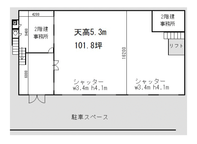- ■シャッター、動力 ■事務所、トイレ、エアコン(残置物) ■車寄せスペース ■駐車場2台分(車種による) ■土日・祝日利用可