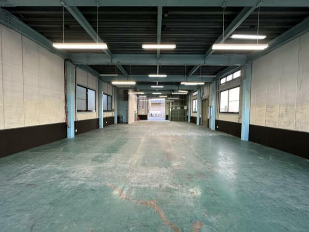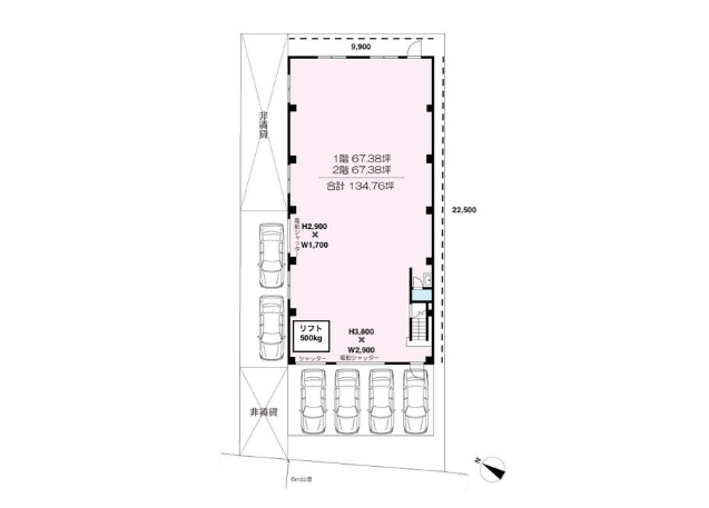 - ■1-2階各67.38坪 ■電動シャッター、リフト(500㎏) ■トイレ2ヶ所、エアコン ■車寄せスペース ■24時間利用可、土日・祝日利用可 ■大型トラック搬入可 ■駐車場空き4台(別途近隣月極駐車場あり)