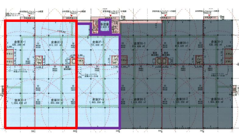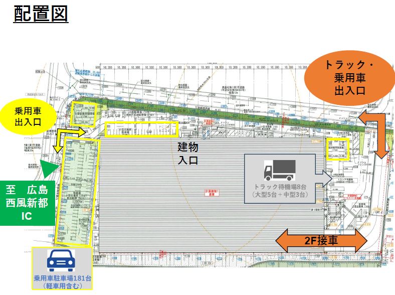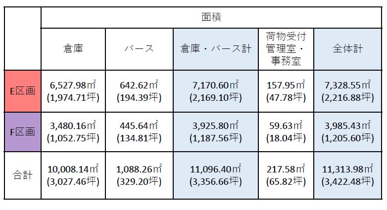 - ■駐車場:181台(管理用含む)小型115台、軽65台、車いす用1台 ■トラック待機スペース:8台(大型5台+中型3台) ■倉庫柱スパン:10.3m×10.5m ■トラックバース:高床式1.0m(1階・2階)奥行 約13.5m ■ドックレベラーあり ■垂直搬送機:E区画1基、F区画1基(積載荷重1.5t)かご寸法3500W×4000D×3200H