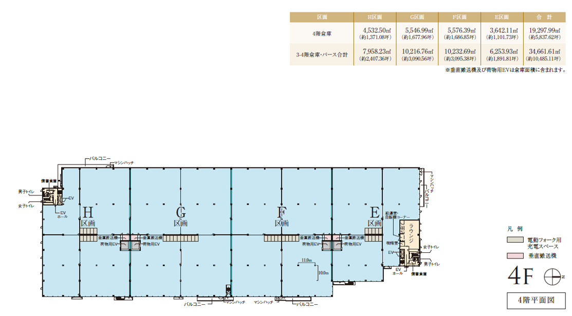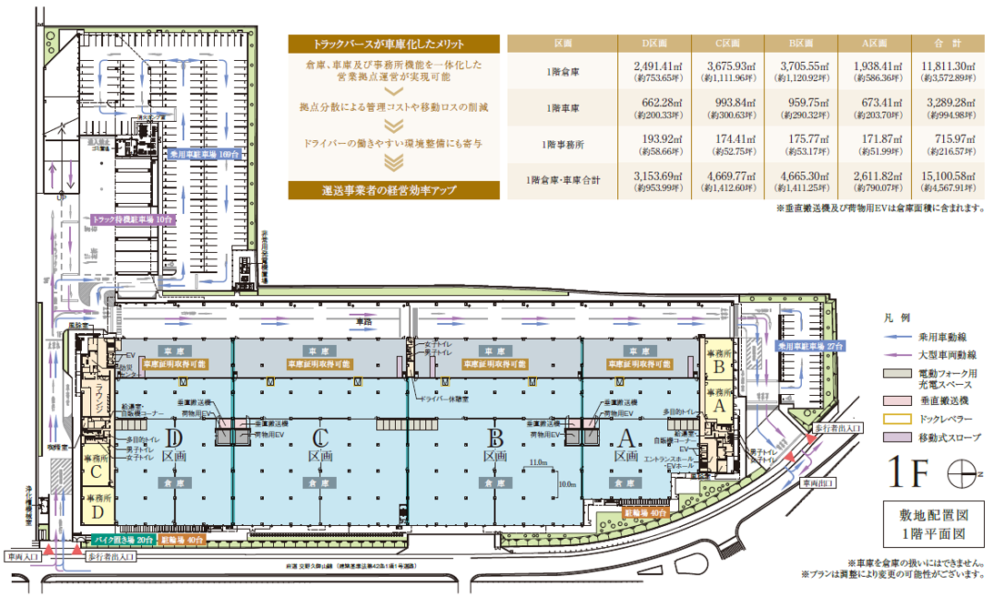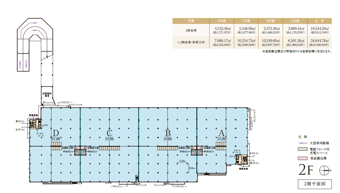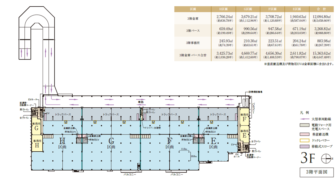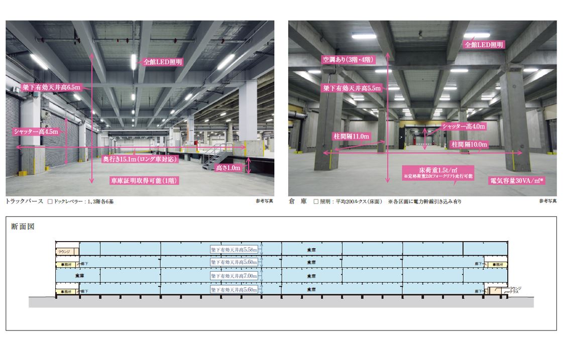 - ■梁下有効天井高:5.5m ■床荷重:1.5t/㎡ ■柱スパン:11.0m×10.0m ■トラックバース台数:36台 ■駐車場:乗用車202台、大型車10台(待機場) ■倉庫面積 62,748.29㎡(約18,981.27坪) ■トラックバース面積:3,268.82㎡(約988.80坪) ■事務所面積:1,599.95㎡(約483.96坪)