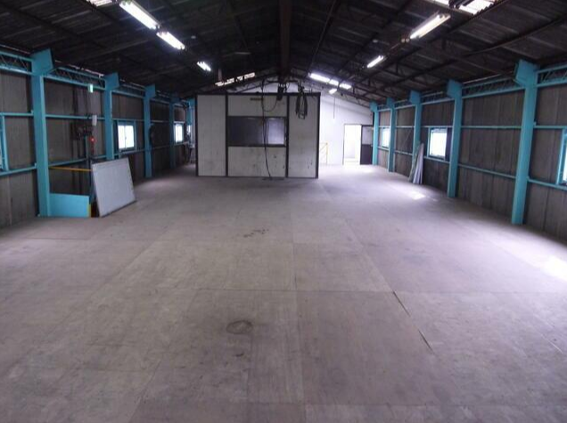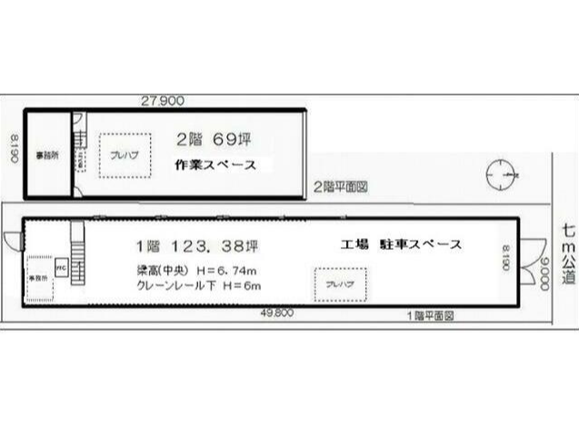- ■1階123.38坪/2階69坪、1棟貸し ■2.8tクレーン2基、1tクレーン1基 ■屋内駐車スペース5~6台 ■トイレ、事務所、プレハブ(会議室)有り